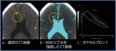 また,Raw Data Based Dual Energy CT(rDE)では,実効原子番号(Effective Z),電子密度(Electron Density),Basis Material Analysis(BMA)などの機能があるが,ここでは個人的に特に期待しているBMAについて少しだけ紹介する。BMAとは,すべてのボクセルを2つの基準物質で構成されていると仮定し,それぞれの基準物質にどのくらい似ているかをベクトルで表したものである(基準物質として定義する物質は任意であるが,1つは弁別したい物質を基準物質に設定するとよい)。図2は脳転移の症例で,石灰化を伴った結節が複数認められ,前方の結節の周囲には浮腫を思わせる低吸収域が認められる。BMAにて水のボクセルを同定し,CT画像上の水の分布を強調表示させることによって,より確実に浮腫と診断できる2)。BMAで選択できる物質は複数選択することができ,骨や空気,水,筋肉,腫瘍などの異なる物質が多く存在する頭頸部領域では,BMAの技術が発達すれば,ある意味ではMRIに近い,造影剤を使用せずにコントラストを付けた画像が得られるようになることが期待される。
