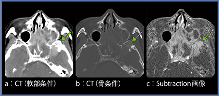 一方,Subtraction は,造影前後の画像を差分処理し造影剤を弁別している。そのため,ADCTの特性と相まって,非常に弁別精度の高い画像が得られる。図3は鼻腔がんの症例である。左蝶口蓋孔から左上顎洞後壁を介して左翼口蓋窩に至る進展を認め,さらに左正円孔周囲を介して中頭蓋窩左側に至る進展を認める。図3a,b↓の蝶形骨左大翼は健側と比較して濃度上昇を示しており,骨浸潤が疑われる。Subtractionを用いると,この部分が明瞭に描出され,浸潤と断定できる2)(図3c↓)。また,オリジナルのCT画像では,液体の部分の濃度が上がっており,病変との境界が不明瞭になっているが,Subtraction画像では造影剤が高い精度で弁別され,境界が明瞭になっている。さらに,増強効果が蝶形骨洞の中隔に沿って頭蓋底まで連続しており,こちらにも浸潤していることがわかる2)(図3c)。