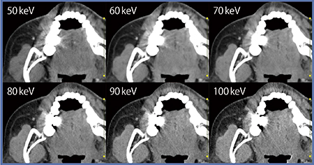 メタルアーチファクト低減には,DECT とSEMAR の2つのアプローチがある。図4に,DECTの仮想単色X線画像(50〜100keV)を示す。高エネルギーの画像ほどメタルアーチファクトを含めてストリークアーチファクトが低減され,周囲組織の辺縁がより明瞭に描出されるが,ノイズも増加する。観察に適切と思われるエネルギーは80keV程度と思われる(図4)。