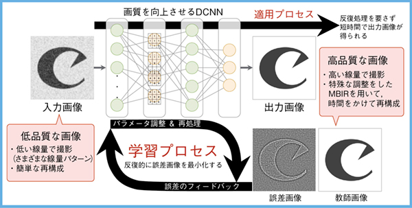 DLRのAiCEは,「画質を向上させる」「ノイズを低減させる」ことを目的としたDCNNを用いている(図1)。AiCEの学習プロセスは,まず入力画像を未学習の「画質を向上させるDCNN」で処理して出力画像を得る。この出力画像を目標とする高画質の教師画像と比較することで,誤差を算出できる。さらに,誤差を0にするために,DCNNに誤差をフィードバックして,畳み込みフィルタのパラメータを調整・再処理する。このプロセスを繰り返すことで誤差が0になり,高画質画像が出力される。教師画像には特殊なMBIRで長時間かけて再構成処理した高品質データを使用し,入力画像には低線量撮影,短時間で再構成処理した低品質データを用いている。トレーニング時点では学習プロセスを反復するため多くの時間を要するが,臨床では1回のプロセスでFIRSTの3~5倍の高速処理が可能であり,短時間で高画質の出力画像を得ることができる。