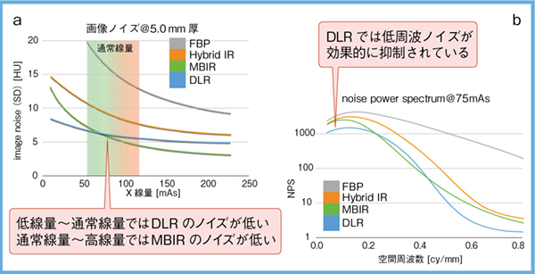 画像のノイズ特性については,外径200mmのファントムでの計測を行った(図2)。Hybrid IRのSDが10を下回る辺りがルーチン検査での線量になるが,低線量から通常線量まではDLRのノイズが最も低いという結果が得られ,通常線量から高線量まではMBIRの方が低かった(図2 a)。また,ノイズの周波数特性は,75mAsで計測した(図2 b)。NPSはノイズの粒状性を示す指標であり,低周波ノイズでは粒状性が粗く,高周波ノイズでは細かくなる。FBPでは,全体的にノイズが多く含まれており,Hybrid IRとMBIRは高周波ノイズを効果的に除去できているものの,低周波ノイズはFBPとあまり差がない。DLRは,高周波ノイズだけでなく低周波ノイズも効果的に抑制されており,粒状性の細かい画像が得られている。