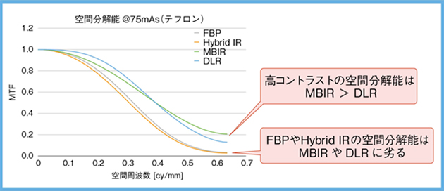 高コントラスト分解能(空間分解能)については,高周波域でMTFの数値が高いほど空間分解能が高いと言える。このことから,FBPやHybrid IRの空間分解能は,MBIRやDLRよりも低いことがわかる(図3)。また,MBIRとDLRとの比較では,高周波(高コントラスト)の空間分解能はMBIRの方が優れているという結果になった。