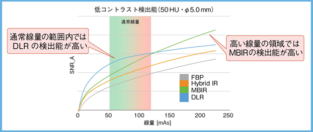 一方,低コントラスト分解能(検出能)の検証では,ノイズの周波数特性や対象物のコントラスト,サイズを加味した視認性を定量的な指標として数値化した。この結果,低線量から通常線量域では,DLRの検出能が最も高いという結果が得られた(図4)。さらに,臨床では使用しない通常線量の2~3倍の高線量域では,MBIRの検出能がDLRよりも高くなった。これは,DLRの画像が教師画像を超えて高画質化できないことを示している。