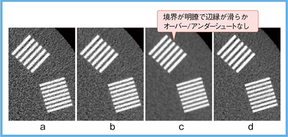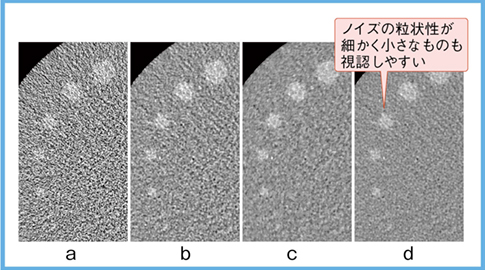 FIRSTは優れたノイズ低減効果が得られていたが,2017年4月に上市された超高精細CT「Aquilion Precision」では新たな問題が生じている。超高精細CTのSHR(super high resolution)モードでは受光面が小さくなるため,通常の線量だとFBPではノイズが増加してしまう。MBIRでは,ノイズが低減されているものの粒状性が粗い画像となるため,ノイズと構造物との区別が難しくなる。つまり,MBIRは,高コントラスト領域において,低線量撮影では通常の線量と同等の画質が得られ,通常線量撮影では高い空間分解能を得られる。ただし,低コントラスト領域において線量が不足していると,ノイズを低減できるものの粒状性が粗また,MBIRは順投影と逆投影を繰り返し行うため時間を要する。反復計算の回数を増やすことや,詳細な物理モデルを組み込むことで高画質化を図れるものの,現状では臨床での実用性を踏まえ処理時間を5分程度としているために,低コントラスト領域の画質改善が不十分になっている。