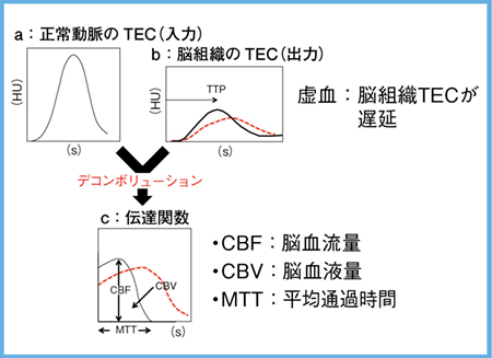 CT perfusionの画像解析の手法は,正常動脈のtime enhancement curve(TEC)を入力ととらえ,伝達関数を用いてコンボリューション(畳み込み)解析することで,脳組織のTECが出力されるという概念に基づく。実際には,CTから得られるデータは正常動脈のTECと脳組織のTECであり,これらをデコンボリューション(逆畳み込み)解析1)することで,ソフトウエア上において伝達関数が求められる(図1)。この伝達関数により,脳血流量(cerebral blood flow:CBF)や脳血液量(cerebral blood volume:CBV),造影剤の通過時間を表す平均通過時間(mean transit time:MTT)といった灌流パラメータを算出することができる。脳虚血により脳組織TECに遅延が生じると,カーブの形状が変化し(図1 b),この変化が伝達関数(図1 c)に表れて灌流パラメータに反映される。