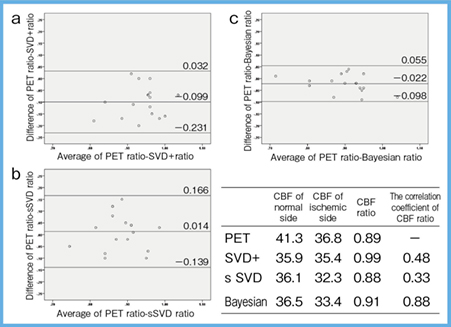tracer delayを考慮したSVD+(図3 a)は,PETと比べ虚血を過小評価するため差(縦軸)はマイナスに分布し,バラツキも大きくなる。tracer delayを考慮しないs SVD(図3 b)は,PETとの差(横軸)は小さいがバラツキは大きくなる。これらに対してベイジアンアルゴリズム(図3 c)は,差もバラツキも小さく,PETと同じような患側健側比を得られており,安定した結果を得られることがわかる。