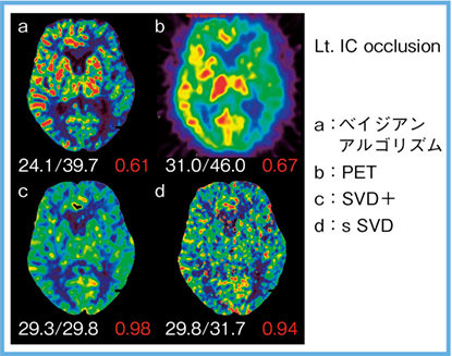 左内頸動脈閉塞症例について,3つの解析手法とPETで得られたCBF画像を示す(図4)。PET(図4 b)では左側の血流が低下して左右差が認められるのに対し,ベイジアンアルゴリズム(図4 a)では同じような左右差が認められるが,SVD+(図4 c),s SVD(図4 d)では左右差があまり認められないことがわかる。