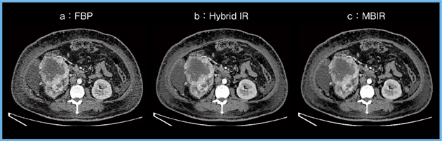 胸部CT(肺野)においては,MBIR画像はFBP画像やHybrid IR画像と比較して,空間分解能が高く,ノイズも低くなり,有用性が高いと報告されている4)。しかしながら,腹部CTに各画像再構成法を適用してみたところ, Hybrid IRと比較してMBIRの画質が向上しているとは言いがたい画像となった(図1)。実際に腹部CTではMBIRを適用しても,特に線量が十分でない場合には低コントラスト病変の検出能が向上しないことが報告されている5)。