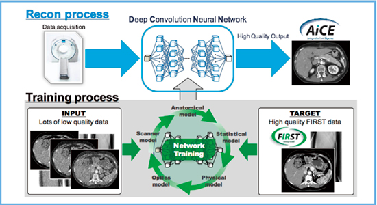 そこで,腹部CTの画質改善に期待されるのが人工知能(AI)である。高品質なCT画像(高線量,理想的な条件のMBIR)を教師にして学習したAIを用いれば,腹部CTの画質を改善できると考えられ,開発されたのがDLRのAiCEである(図2)。