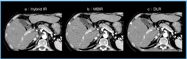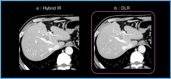 当院にて,まず「Aquilion ONE」を使用し,転移性肝腫瘍をターゲットに腹部CTにおけるDLRの初期検討を行った(解析当時はW.I.P.*)。結果として,Hybrid IR画像と比較し,DLR画像ではノイズが大幅に低減し,腫瘍を明瞭に描出できていた(図3)。詳細は割愛するが,DLRは腹部CT画像を定性的にも定量的にも改善しており,DLRは肝腫瘍検出能を向上させる可能性があると考えられた。