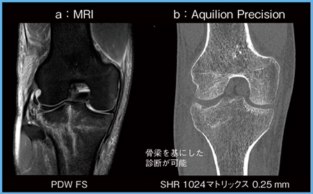症例2は,22歳,男性,脛骨高原骨折である(図2)。MRI(図2 a)と比較して,Aquilion Precisionでは骨梁の異常が明瞭に描出されており(図2 b),骨梁を基にした診断にきわめて有用である。