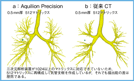 さらに,1mm外径気管支について,従来CTとAquilion Precisionのそれぞれ1024マトリックス画像の描出能を比較したところ,Aquilion Precisionでは約8割が描出できていたのに対し,従来CTでは約4割であった。そのため,当院では,気管支の読影にはAquilion Precisionの1024マトリックス画像を用いている。