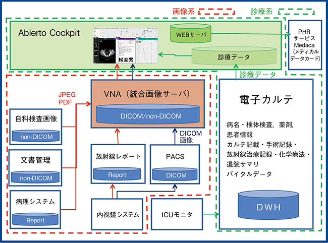 そこで,AIホスピタルシステム事業の“患者医療情報の統合表示基盤”として,Abierto Cockpitを導入した。VNAに保存されているDICOM画像やnon-DICOM画像,各種検査レポートに加え,電子カルテの診療データを併せて参照できるシステムを構築した(図2)。