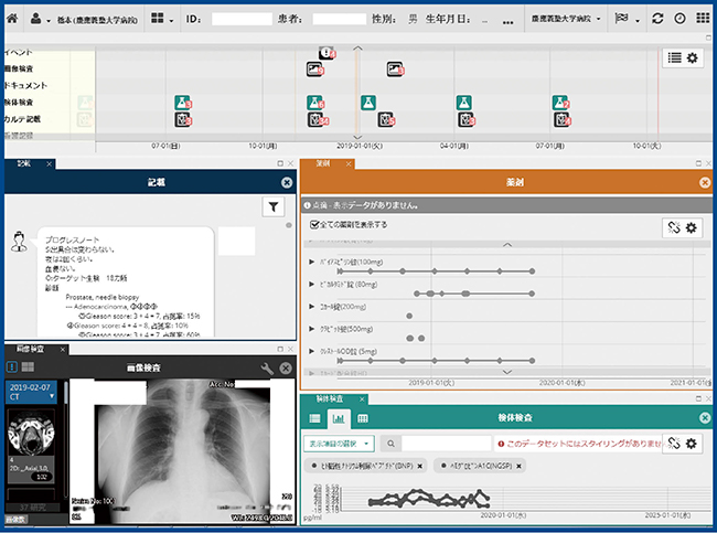 Abierto Cockpitでは,タイムラインとデータパネルで必要なデータを一覧で表示できる(図3)。時系列データでは,さまざまな時間軸をそろえて表示できるほか,検査データに変化があった時にどんな薬剤を飲んでいたのか,その時に撮ったCT画像などをすぐに表示して参照できる。