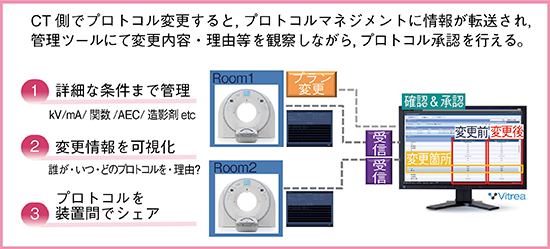 同社の線量管理システムでは,はずれ値を検出して検査内容を確認し,インシデントの有無を検討できるようになっている(図2)。また,はずれ値を除外して線量調査の結果をまとめることが可能で,これらの機能により線量管理を省力化できる。さらに,医用画像処理ワークステーション「Vitrea」の“CTプロトコルマネジメント”機能(図3)では,複数台のCTのプロトコルをまとめて管理することができ,管理者の負担を軽減し,円滑な線量管理を支援する。このようなシステムが今後も進歩していくことを期待している。