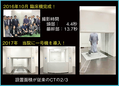 そこで,64列CTにて軀幹全体を20秒程度で撮影可能となっていた2012年,東芝メディカルシステムズ(現・キヤノンメディカルシステムズ)に立位CTプロジェクトを提案した。その後,2014年に機器開発に着手し,2016年に臨床機が完成,2017年には当院に第一号機を導入した(図1)。立位CTの撮影時間は,頭部が約4秒,軀幹部が約14秒であり,設置面積は臥位CTの2/3というメリットもあった。