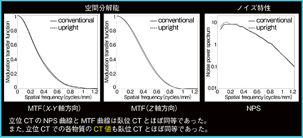 ファントムを用いた性能評価の結果,立位CTの空間分解能やノイズ特性,CT値などの物理特性は,従来の臥位CTと同等であった1)(図2)。立位であっても,検出器が完全に水平に上下動することで,画質の劣化は認めなかった。また,立位CTでの撮影の場合,検査室への入退室時間が約40秒と,一般撮影と同様の撮影が可能であり,臥位CTでの撮影よりもワークフローが改善した1)。安全性については,撮影時の安定を保つために背中を支える柱を立て,転倒防止装置も設置されている。被検者に対して行った安全性・快適性に関するアンケートでは,5点満点中,平均で4点以上の高い評価が得られた1)。