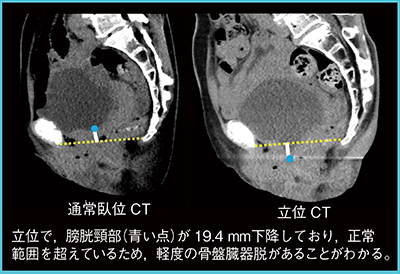 図4は,下腹部違和感のある症例である。産婦人科の受診でも原因不明であったが,立位CTでは膀胱頸部が19.4mm下降しており,軽度の骨盤臓器脱があることが明らかとなった。