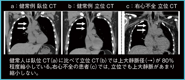 静脈は体位によって径が変化することが知られているが,これまでに全身を系統的に評価されたことはなかった。健常例における臥位と立位のCT画像(図5 a,b)を比較したわれわれの検討では,立位では上大静脈径(→)が約80%縮小し,逆に下大静脈径は約37%増大した。また,横隔膜の高さでは,臥位と立位で静脈径は変わらず,変化率は部位によって異なることが明らかとなった1)。一方,心不全の患者では,立位でも上大静脈径があまり縮小しないため(図5 c→),静脈径の変化率は心不全の重症度と相関すると考えられた。