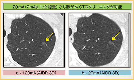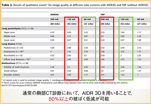 ACTIveでは,AIDR 3Dによる線量低減について検討を行った3)。AIDR 3Dの120mAとFBPの240mA,およびAIDR 3Dの60mAとFBPの120mAの画質を定性的に評価したところ,AIDR 3DはFBPの半分の線量であるにもかかわらず,肺実質,肺病変,縦隔のいずれにおいてもスコアは同等か,それ以上であった(図1)。通常の胸部CT診断において,AIDR 3Dを用いることで,50%以上の被ばく低減が可能であることが明らかとなった。