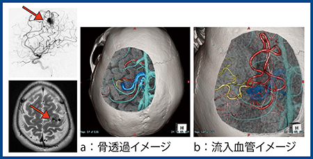 症例1(図1)は20歳代,男性で,左前頭葉運動野のAVM(→)である。骨透過イメージ(a)では全体構造を把握するとともに,開頭やアプローチ,髄液排出部位を想定することができる。流入血管イメージ(b)では血管を色分けすることで,どの血管から流入しているかが一目でわかるようにしている。脳や異常血管塊(nidus),流出静脈を透過することで流入血管を抽出でき,実際の術野はおおむねプランニング画像どおりであった。