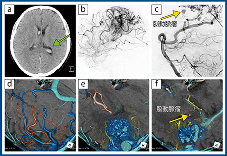 症例2(図2)は40歳代,女性,出血発症のAVM(←)である。AVMが散在しており切除ラインの決定が難しい症例だが,詳細に検討すると出血は脳室内に限局しており,脈絡叢内側に確認された脳動脈瘤(→)が出血源と判断されたことから,動脈瘤切除を行った。プランニングでは,脳表から脳と血管を削っていくような画像を作成することで,脳溝とAVM,脳室の位置関係を把握でき,nidusに接しながら脳室に向かうことで脳動脈瘤に到達するというイメージを持つことができる(d〜f)。