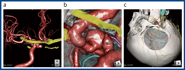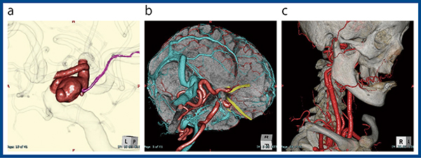 症例3(図3)は,50歳代,女性の内頸動脈瘤である。Aquilion Precisionでは,穿通枝の前脈絡叢動脈を明瞭に描出でき,また後交通動脈が動脈瘤の内側に張り付くように存在していることを確認できる(a)。前脈絡叢動脈だけでなく,後交通動脈の梗塞でも高次脳機能障害が生じうることから,いかにこれら穿通枝を温存してクリッピングを行うかが課題となる。そのためには静脈灌流の把握が重要で,本症例では主に下吻合静脈方向に灌流していることがわかる(b)。また,比較的大きな動脈瘤では近位部を把握するために頸部の情報も必要だが,Aquilion Precisionでは頸部血管も同時に撮影可能である(c)。