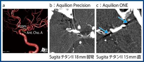 術後評価で問題となるのがクリップの金属アーチファクトで,われわれの検討2)ではブレードサイズが10mm以上になると有意にアーチファクトが増加する結果となった。しかし,Aquilion Precisionでは金属アーチファクトの低減が可能になり,「Aquilion ONE」で撮影した画像では目立っていた長軸方向の黒いダークバンドアーチファクトを抑制することができる(図5 b,c↓)。症例3では18mm弱彎クリップを使用したが,アーチファクトが抑制され,穿通枝や虚脱した動脈瘤,後交通動脈や前脈絡叢動脈の温存も確認できた(図5 a)。