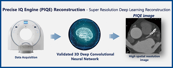 PIQEは,Deep Learningを用いて従来画像を高分解能化する新たな画像再構成法である。冠動脈CTにおいては,FIRSTより高分解能,AiCEより低ノイズを実現しており,PIQEはFIRSTとAiCEの利点を併せ持つ画像再構成法であると言える。