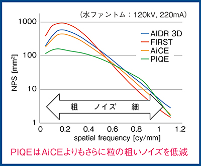 水ファントムを用いてNPSを比較したところ,粒の粗い低周波ノイズはPIQEにて最も低減されており,AiCEよりも低減効果が高かった(図2)。