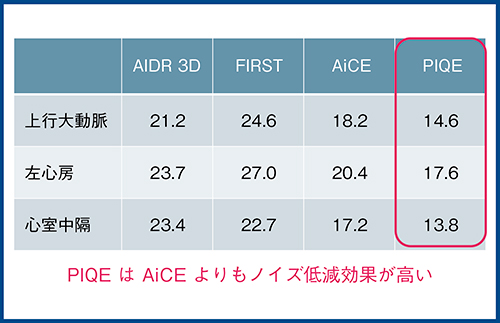 次に,上行大動脈,左心房,心室中隔にてSDを計測したところ,PIQEはAiCEよりも高いノイズ低減効果を認めた(図3)。