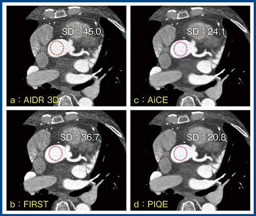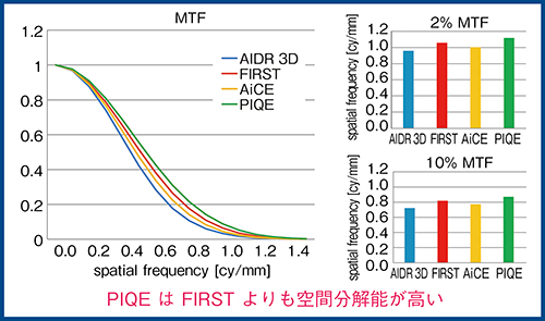 AIDR 3D,FIRST,AiCE,PIQEについて,ノイズ特性(NPS),画像ノイズ(SD),空間分解能(MTF)を比較した。