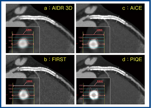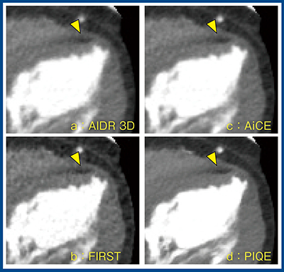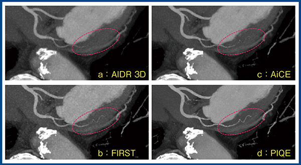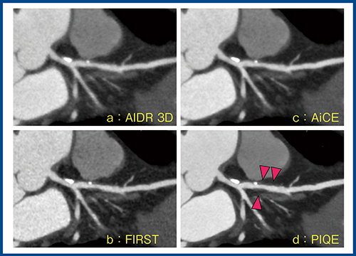 図7は冠動脈末梢のMPR画像であるが,PIQE(d)では,AIDR 3D(a)やAiCE(c)と比べてより末梢まで描出されている()。FIRST(b)でも描出されているが,PIQEの方がより明瞭である。