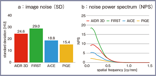また,NPS(図1 b)については,一般的なノイズ低減を伴う画像再構成法は低周波側のノイズ成分が増加する傾向にあるが,PIQEでは低周波側がやや増加するものの分布が平坦で低周波ノイズも抑制できている。このことから,PIQEではノイズの粒状性が細かく,診断しやすい画像を得られることがわかる。