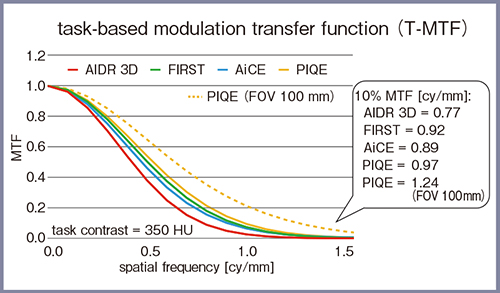 また,10% MTFを計測すると,AIDR 3Dの0.77に対し,PIQEのFOV 200mmが0.97,FOV 100mmでは1.24まで上昇する。1024マトリックスの画像を作成できるようになれば,非常に高いパフォーマンスを臨床で利用できるようになると考えられる。