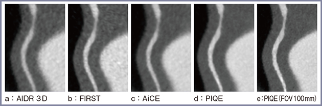図3に,ファントムの冠動脈の模擬狭窄部分のcurved MPR(CPR)画像を示す。FIRST(図3 b)では空間分解能に優れた画像が,AiCE(c)では非常にノイズの少ない画像が得られているが,PIQE(d)では高空間分解能とノイズ抑制を両立した画像が得られており,狭窄部分の血管内腔を良好に視認できる。また,FOV 100mmにすることで,さらに空間分解能が向上する(図3 e)。また,従来画像再構成法では狭窄部分はパーシャルボリューム効果によりCT値がやや低下しているが,PIQEではCT値が低下することなく描出されている。