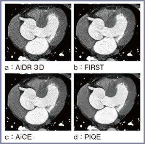 撮影には「Aquilion ONE / GENESIS Edition」を使用し,SD(標準偏差)=23HU,マトリックスサイズは512×512,再構成FOVは200mmとし,PIQE Cardiacの比較対象として,従来再構成法の“Adaptive Iterative Dose Reduction 3D(AIDR 3D)”(FC 14),FIRST Cardiac,AiCE Cardiacで画像を再構成した。画像の評価方法としては,均一領域のCT値のバラツキを表すSD,ノイズの周波数分布を表すNPS,空間分解能の特性であるtask-based modulation transfer function(T-MTF)を計測した。左心室内腔の均一な領域のCT値から計測するNPSは,ROIの大きさの制約により低周波側は計測できないが,おおよその傾向は評価できる。また,T-MTFは,左室内腔と心筋の境界のプロファイルカーブからエッジ法で計測している(⊿HU≒350HU)。