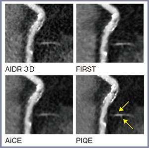 同症例のCPR画像でソフトプラークによる約50%狭窄がある部分を拡大すると,PIQEではほかの再構成法と比較して,内腔とプラークの境界が明瞭に描出されていることがわかる(図5)。また,右側に分枝が確認できるが,PIQEでは分枝からさらに分岐する細い血管(←)も描出されており,PIQEが微細血管の描出においても有用であることがわかる。
