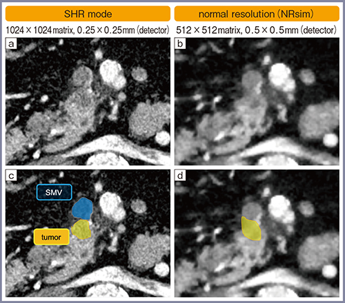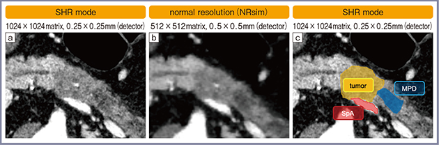 図1は症例1(70歳代,男性)の画像で,aはSHRモード(0.25mm×0.25mm)で撮影して1024×1024マトリックスで再構成した画像,bはaの画像を基にシミュレーションで作成したNRモード(0.5mm×0.5mm)撮影,512×512マトリックス再構成の画像(NRsim)である。また,図1 cに,aを基にした解剖情報を図示する。本症例は約20mmの比較的大きな膵がんで,膵体尾部の境界領域に腫瘍が認められる。NRsimに比べSHRモードでは,拡張した上流膵管(MPD)や背側に走行する脾動脈(SpA)と腫瘍の接触の様子をより明瞭に視認でき,腫瘍の境界領域,前方浸潤,後方浸潤の状態を把握しやすい。