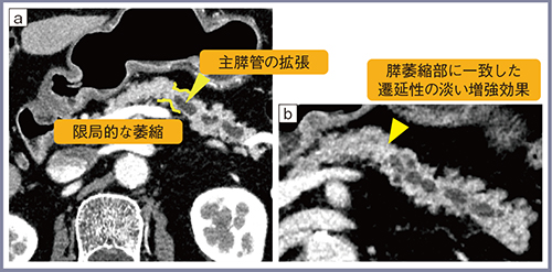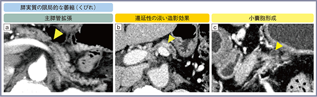 膵がんの存在を示唆するCT所見としては,膵実質の限局的な萎縮(くびれ)や主膵管の拡張(図4 a)のほか,主膵管の途絶部位における遷延性の淡い造影効果(図4 b)が報告されており,これは膵がんがあることで周囲の膵実質に線維化を来し生じる変化と考えられている。また,主膵管が途絶している部位においては,視認できない膵がんの周囲に小さな囊胞を形成している症例がある(図4 c)。これは,膵がんがあることで末梢分枝膵管が閉塞して生じる所見と言われている。