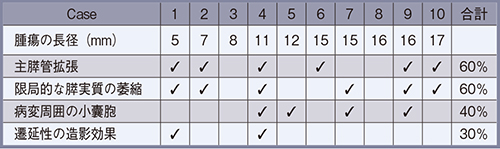 前出のAquilion Precisionによる早期膵がんの検出率の検討において,Aquilion Precisionで同定困難であった10例について,膵がんの存在を示唆する所見の有無を確認した(表1)。腫瘍径による所見の傾向は見られなかったが,10例中8例は1つ以上の所見が確認されたことから,このような副次的な所見を見逃さないことが,日常臨床において重要であると考える。