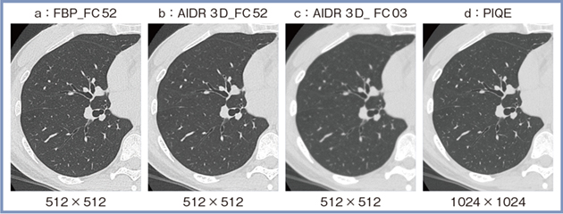 当センターでは,高精細CTとArea Detector CT(ADCT)の2台が稼働している。PIQEは,高精細CTのノイズの少ない高画質な画像データを教師画像に用いて,従来のADCTの画像を高空間分解能かつノイズを低減する再構成技術である。当センターで撮影した画像を示す(図1)。肺の画像診断では,肺野の細い血管や末梢の気管支を見るために,肺野条件と縦隔条件を使って観察するが,FBPや「Adaptive Iterative Dose Reduction 3D(AIDR 3D)」を適用した肺野条件の画像では輪郭はシャープに描出されるもののノイズが増え(図1 a,b),縦隔条件の画像ではノイズは低減されるが輪郭はぼやけてしまう(図1 c)。一方,PIQE Lungではノイズが抑制されており輪郭もシャープに描出されている(図1 d)。