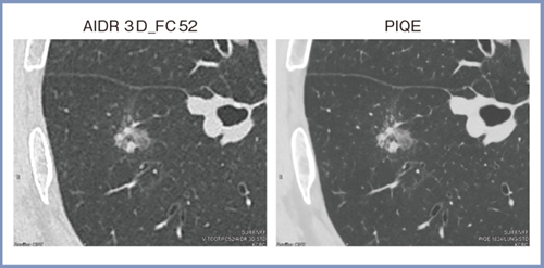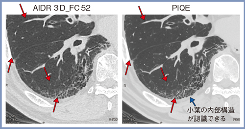 PIQEでは,肺野領域においてノイズを低減しながら,解像度を向上することが可能になる。PIQE Lungを適用することで,末梢気管支の描出が可能になり,間質性肺炎をはじめとするびまん性肺疾患の鑑別に有用だと考える。また,定性評価だけでなく,%LAAなど定量評価においても有用性が期待できる。