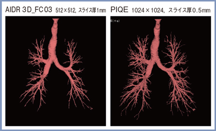 肺がんの診断では,結節内部の性状を把握することが重要だが,PIQE Lungでは結節内の不整な気腔の拡張が明瞭に描出されている(図2)。また,気管支の自動抽出では,PIQE Lungで処理することで,ADCTの画像でもより末梢まで描出が可能となる(図3)。このような画像を用いることで,肺がん症例に対する気管支鏡検査のナビゲーションの精度が向上することが期待できる。