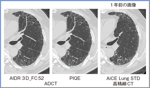 図5は間質性肺炎の症例だが,PIQE Lungでは末梢の牽引性気管支拡張がより明瞭に描出されており,胸膜直下の蜂巣肺を含めてより診断がしやすい画像になっている。1年前に撮影した高精細CT〔Advanced intelligent Clear-IQ Engine(AiCE) Lung〕の画像と比較しても同等の画質が得られている。