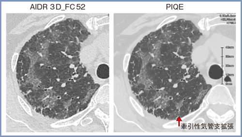 PIQE Lungは,びまん性肺疾患の鑑別にも有用であると考えられる。従来の肺野条件(FC52)では,CT値の低い肺野と胸壁などのCT値の高い領域が接する部分や,肺野内の血管壁などにアンダーシュートアーチファクトが発生していた。PIQE Lungでは,それがほとんど見られなくなり,肺野内の末梢気管支の拡張も拾い上げられるようになった。