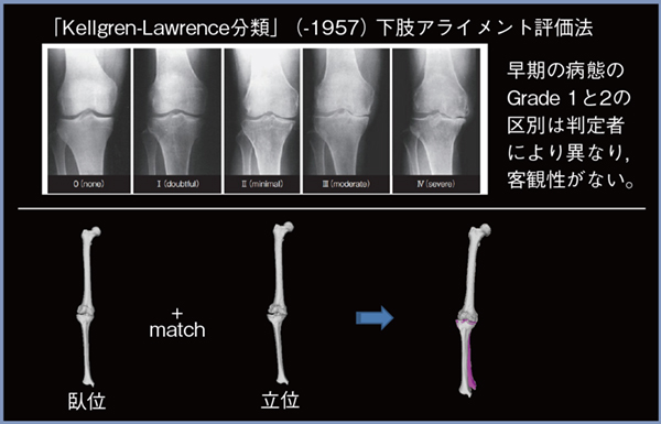 変形性膝関節症は,Kellgren-Lawrence分類(K-L分類)を用いて重症度判定を行うが,早期のgrade 1と2の区別は判定者によってバラツキがあり,客観性に乏しい。そこで,立位と臥位のCT画像にて大腿骨と脛骨の回旋のズレを見ることで,早期の分類が可能か検討したところ,grade1と2では明確な回旋の差があることが明らかとなった(図1)。立位CTは,早期の変形性膝関節症の診断への有用性が期待される。