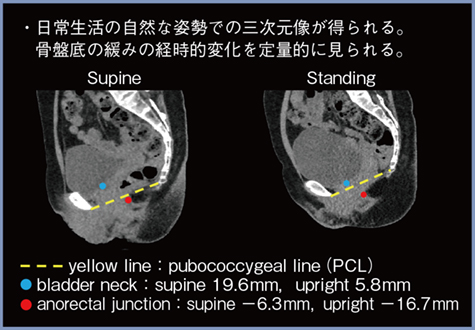 また,骨盤底筋の弛緩が排尿障害の原因となることが知られているが,立位CTでは骨盤底筋の弛緩の経時的変化を定量的に測定することも可能である(図4)。従来,骨盤底は臥位と座位で位置が変わらないとされ,立位での骨盤底を評価した研究はなかった。しかし,立位CTにて,膀胱頸部は健常者でも男性は6mm,女性は10mm降下することが明らかとなり,排尿障害が女性に多いこととの関連が考えられた4)。そのため,今後は立位CTの計測結果に基づいた健康診断の構築を検討している。