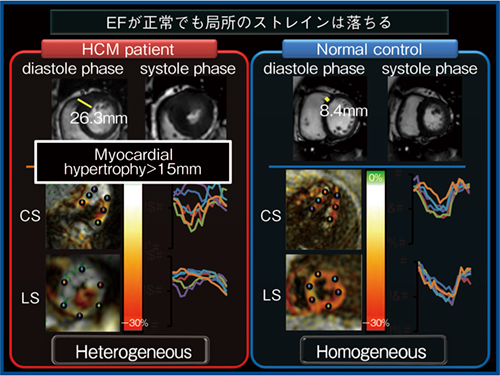 われわれは,肥大型心筋症(HCM)におけるストレインの検討2)を行った。正常例と左室駆出率(LVEF)が保たれたHCM症例のストレイン比較では,HCMでは局所のストレインが低下し,ストレインカーブのピークのタイミングがバラついていた(図1)。また,HCMにおけるMRIストレインのバラツキと遅延造影(LGE)の関係を見ると,LGEの広がりが大きいほどストレインのバラツキが大きかった。さらに,15%を超えると突然死リスクが高い予後不良因子である%Extent LGE(心筋全体に対してLGEが占める割合)を非造影MRIストレインで予測可能であった。