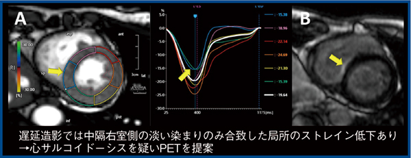 われわれは,心サルコイドーシスの診断にストレインの局所解析が有用だった症例を経験した5)。本症例は,LGEで確認された中隔右室側の淡い染まりに合致して局所ストレインの低下が見られたことから,心サルコイドーシスを疑いPET検査を提案した(図3)。PETでは,FDG投与60分後の画像で縦隔リンパ節への集積亢進が見られたものの心臓への集積は不明瞭で陰性のように思われたが,120分後の画像では心臓中隔への強い集積が明瞭化し,活動性の心サルコイドーシスと診断できた。これはFDGのピットフォールであり,心臓を評価する場合には120分後の撮像を追加することが重要である。